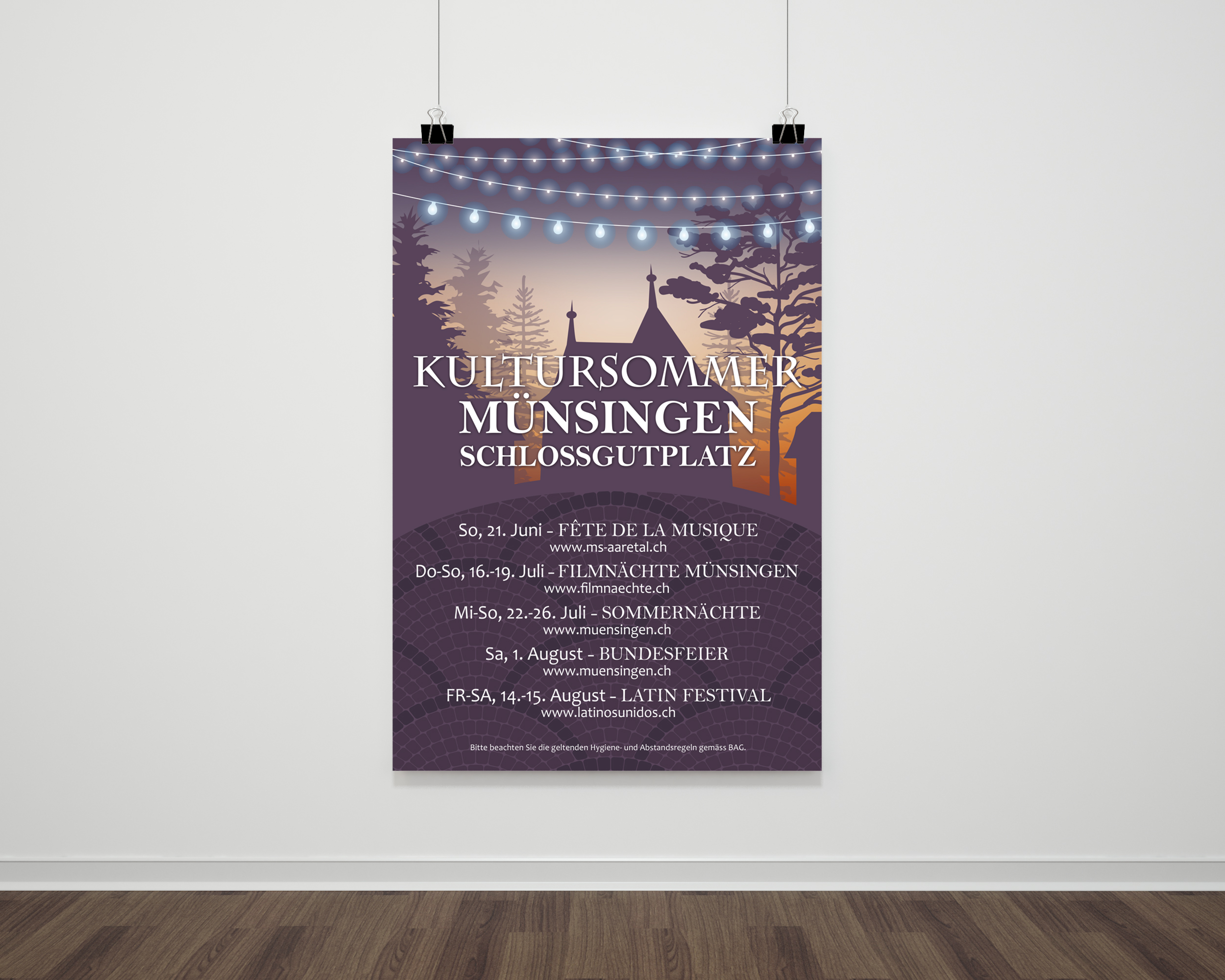 Ein Plakat, das Ort und Stimmung transportiert. Der Schlossgutplatz wird sofort erkennbar, das Motiv wirkt ruhig, einladend und sommerlich. Das Design verbindet die verschiedenen Anlässe zu einem gemeinsamen Kultursommer und schafft einen Wiedererkennungswert für das Kulturangebot der Gemeinde Münsingen.